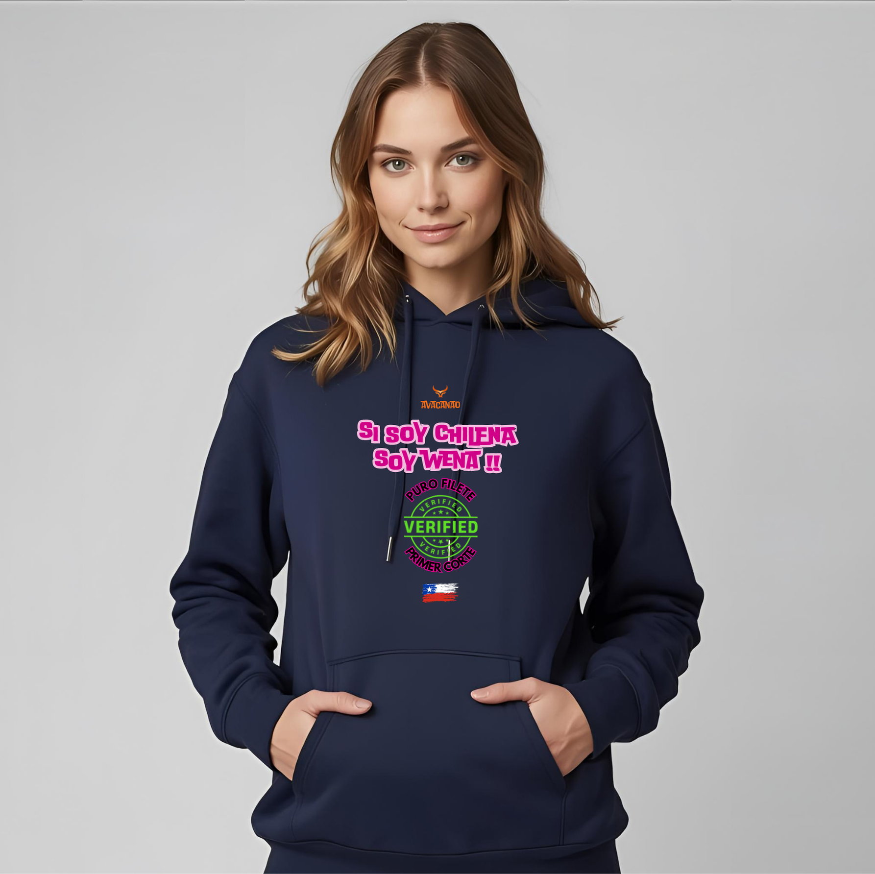 Polerón negro con capucha tipo canguro 100% algodón con frase típica chilena "Si soy chilena soy wena"